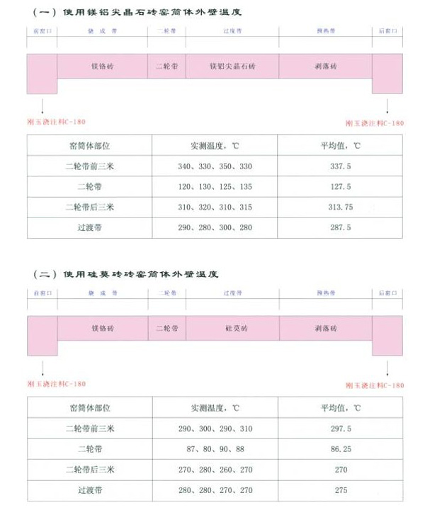 使用硅莫磚與鎂鋁尖晶石磚窯筒體外壁溫度示意圖