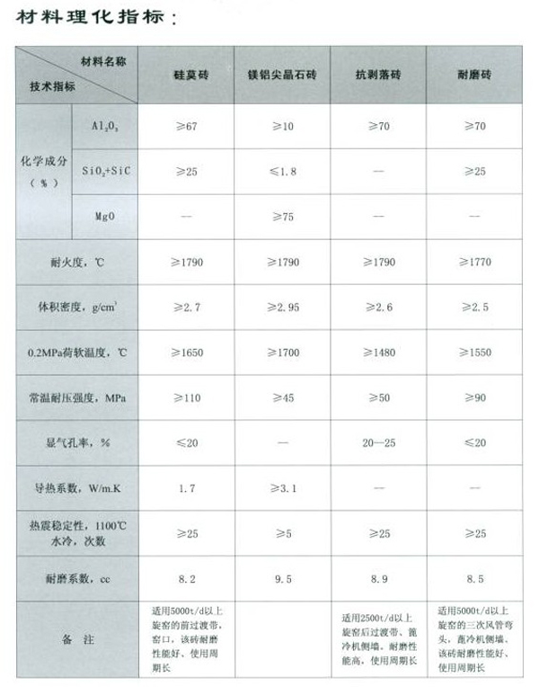 近年來(lái),隨著國(guó)內(nèi)水泥工業(yè)的不斷發(fā)展,旋窯生產(chǎn)越來(lái)越大型化,水泥日產(chǎn)量不斷提高,窯的旋速加快,窯徑加大,對(duì)耐火材料的要求越來(lái)越高,希望耐火材料具有較好的抵抗機(jī)械應(yīng)力破壞的能力。前一階段,我們國(guó)內(nèi)回旋窯在燒成帶、過(guò)渡帶采用了鎂磚系列、尖晶石系列;在預(yù)熱帶采用了抗剝落、高強(qiáng)耐堿磚系列,效果尚好,基本能滿足回旋窯運(yùn)行的要求,同時(shí)也反映出以上材料一些不足:用于過(guò)渡帶的尖晶石磚系列由于它的導(dǎo)熱系數(shù)大,窯筒體外壁溫度較高,極易受熱膨脹,致使窯中部托輪承受壓力較大,托輪瓦溫度升高,影響設(shè)備的正常運(yùn)行;用于預(yù)熱帶的抗剝落磚體積密度大,增加了窯筒體負(fù)重,對(duì)動(dòng)力裝置影響較大;用于預(yù)熱器、三次風(fēng)管的高強(qiáng)耐堿磚體積密度大,保溫性能差,達(dá)不到保護(hù)裝置、節(jié)約能源的要求。為使各段耐火材料在整條窯上同步使用,延長(zhǎng)耐火材料的使用壽命,我公司做了大量的工作,同時(shí)借鑒國(guó)內(nèi)外先進(jìn)的技術(shù)和理論依據(jù),對(duì)水泥回旋窯用耐火材料進(jìn)行綜合的技術(shù)開發(fā)和耐材配套使用的研究,開發(fā)出了更具有技術(shù)優(yōu)勢(shì)的替代產(chǎn)品:硅莫磚系列(用于過(guò)渡帶,替代堿性材料)、輕質(zhì)抗剝落磚(用于預(yù)熱帶,替代耐堿磚)、輕質(zhì)耐堿磚(用于預(yù)熱器、三次風(fēng)管,替代高強(qiáng)耐堿磚),對(duì)整條水泥旋窯耐火材料的合理使用有很好的心得,經(jīng)過(guò)近幾年來(lái)用戶的廣泛使用,已達(dá)到整條水泥窯耐火材料同步使用的理想效果。對(duì)2500t/d及2500t/d以上水泥窯配套用耐火材料同樣我們也作了詳細(xì)的技術(shù)分析,提出我們的建議,謹(jǐn)供各單位參考!