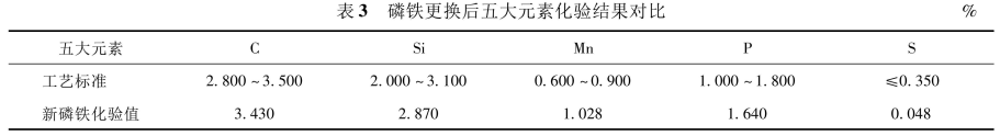 針對磷鐵成分中硫含量高出標準值4.5倍的問題,借鑒同行業做法,整體置換磷鐵,選用專業鐵合金公司配置標準磷鐵予以置換。經過整體更換磷鐵后,五大元素完全符合工藝標準要求,見表3。鐵水流動性得到很大改善,不但陽極澆鑄后磷鐵環平整、飽滿,外觀質量得到根本性轉變,更重要的是鐵水出爐溫度只需1350℃即可滿足澆鑄需求,爐襯工作溫度大幅下降,爐齡得到保障,中頻爐爐齡平均為57天。
