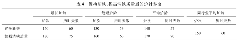 為了使更新的磷鐵成份保持長周期穩定,減少爐渣的產生,降低雜質對爐壁的腐蝕,也為了提高陽極澆鑄質量創造條件,在更新磷鐵后要堅持對回爐鐵進行清理后才能入爐熔煉。因為回爐鐵表面除了附著部分殘極碳粒,還有電解質,這些雜質對爐襯來說都是有害元素,其中碳粒和石英砂在高溫下發生還原反應(SiO2+2C=Si+2CO),而電解質作為堿性物對酸性爐襯同樣具有腐蝕作用,從而破壞爐襯影響爐齡。通過提高磷鐵清理質量,使爐齡在原有基礎上再次延長10~15天,爐次增加30次,見表4