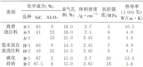 例如:在機(jī)械爐排焚燒爐當(dāng)中,不同部位對于不定形耐火材料的應(yīng)用,有一定的差異性。如:投入垃圾入口處,溫度大概為550℃左右,因?yàn)槔鴷?huì)對其產(chǎn)生沖擊磨損,且垃圾內(nèi)部有一定水分,所以出現(xiàn)熱剝離的概率較大。因此該工作層需要應(yīng)用強(qiáng)度更高,抗熱震穩(wěn)定性更高的澆注料,非向火面則需要應(yīng)用隔熱性能優(yōu)異的隔熱澆注料;爐排區(qū)域兩側(cè)墻溫度通常都要高于800℃,垃圾也會(huì)對其產(chǎn)生磨損,因此在兩側(cè),需要用到抗磨損強(qiáng)、抗高溫?zé)煔饣瘜W(xué)侵蝕性效果較好的碳化硅磚作為向火面第一層,后幾層采用導(dǎo)熱系數(shù)較低的保溫材料;爐膛區(qū)域前后拱及前后墻等部分,因?yàn)楦邷責(zé)煔鈺?huì)對其造成化學(xué)侵蝕作用,需要用到剛玉質(zhì)耐磨澆注料;落灰斗處,溫度相對較低,僅有450℃左右,但依然有殘余物對其造成磨損,所以該層需要用到較高強(qiáng)度的澆注料(如表1、表2)。
