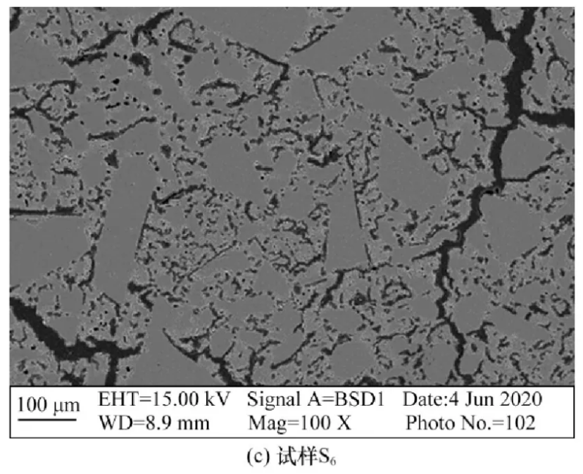 從圖2的顯微結(jié)構(gòu)照片中可以看出,在1400℃下,SiO₂微粉產(chǎn)生的液相填充了基質(zhì)中的許多微小氣孔,并消除了一些閉口氣孔,使得試樣中小孔徑的孔減少;產(chǎn)生的液相在降溫過程中不斷收縮固化,使得許多氣孔相互連通形成大孔徑的孔,且由于熱膨脹系數(shù)的不同,使得基質(zhì)與骨料之間產(chǎn)生許多微裂紋,這些微裂紋也連通許多微小孔和閉口氣孔,使得孔徑變大。因此,隨著SiO₂微粉含量的增加,液相量也不斷增加,上述過程不斷加劇,使得試樣整體孔徑不斷增大。