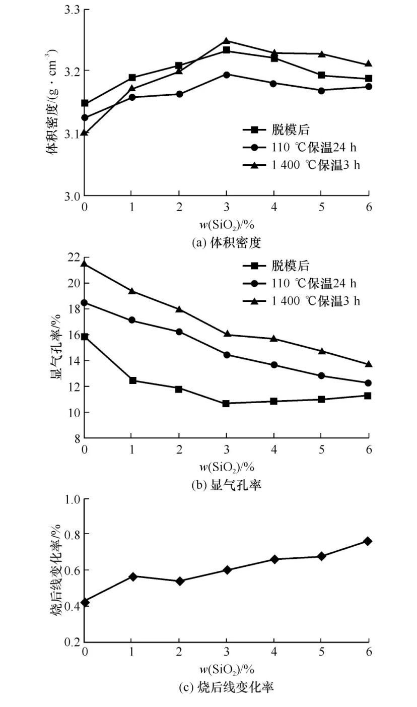 圖3示出了室溫養(yǎng)護(hù)24h脫模后、110℃干燥24h后以及1400℃熱處理3h后試樣的常溫抗折強(qiáng)度和耐壓強(qiáng)度。從圖中可以看出:隨著SiO₂微粉含量的增加,室溫養(yǎng)護(hù)24h脫模后的試樣的常溫抗折強(qiáng)度和耐壓強(qiáng)度逐漸增高;經(jīng)110℃干燥24h后的試樣隨SiO₂微粉含量的增加,其常溫抗折強(qiáng)度和耐壓強(qiáng)度先增加后趨于平緩;在1400℃熱處理3h后,SiO₂微粉含量為0時(shí)的試樣強(qiáng)度最低,低于其烘后強(qiáng)度,其他試樣的常溫抗折強(qiáng)度隨著SiO₂微粉含量的增加略微增加。