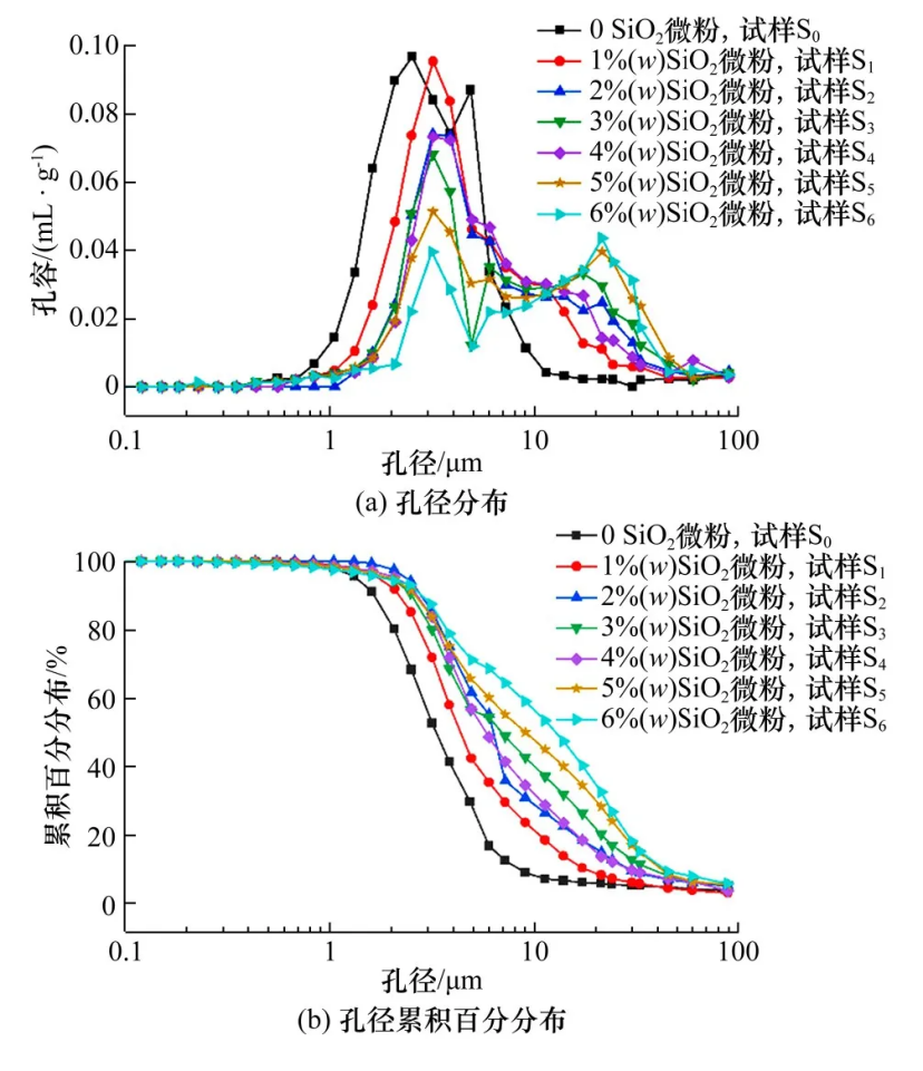 從圖5可以看出:1)在SiO₂微粉含量為0時(shí),孔徑分布圖形較為尖窄,為單峰形狀,平均孔徑為2.9μm,孔徑分布范圍主要集中在1~9μm;隨著SiO₂微粉含量的不斷增加,峰值不斷減少,圖形向右偏,且逐漸呈雙峰分布。2)當(dāng)SiO₂微粉含量(w)為6%時(shí),其平均孔徑為5.5μm,孔徑分布范圍主要集中在2~5、6~40μm;且從孔徑累積百分含量圖中也可以看出,隨著SiO₂微粉含量的增加,其圖形向右偏移。這說明隨著SiO₂微粉含量的增加,試樣整體的孔徑增大。