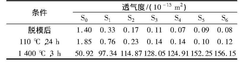 不同SiO₂微粉含量下,試樣脫模、干燥和燒后的透氣度。從表中可以看出:1)脫模和干燥后的透氣度隨SiO₂微粉含量的增加而減小,在SiO₂微粉含量達(dá)到3%(w)以后,其值趨于平穩(wěn)。經(jīng)1400℃熱處理后,試樣的透氣度隨SiO₂微粉含量的增加而逐漸增加;2)脫模和烘后試樣的透氣度值比較接近,而燒后試樣的透氣度是脫模和烘后的幾百倍。這是因?yàn)镾iO₂微粉具有填充空隙作用,試樣S0沒有加入SiO₂微粉,內(nèi)部空隙較多,氣孔率較高,因此連通氣孔較多,透氣性較高;加入SiO₂微粉之后,SiO₂微粉不斷填充空隙,使得大氣孔變成小氣孔,也可能會(huì)封閉一些連通氣孔并形成更多的閉口氣孔,使得透氣性降低。而試樣經(jīng)1400℃熱處理后,隨著SiO₂微粉含量的增加,內(nèi)部產(chǎn)生的微裂紋數(shù)也在不斷增加,這種微裂紋連通許多其他的開口氣孔,形成類似樹枝狀分布的江河流通圖,為氣體的流通和擴(kuò)散提供了方便快捷的通道。