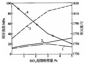 在低水泥耐火澆注料中,超微粉主要起分散促進劑和結構密實劑的作用。前者使水泥顆粒高度分散而不絮凝,后者使組織結構微孔得到充分填實而提高強度。超微粉種類有SiO₂、α-Al₂O₃、Ca₂O₃、ZrO₂和MgO等。SiO₂超微粉的比表面積為20m2/g左右,其粒徑約為水泥顆粒的1/100,因此具有良好的分散性和填充性。圖1為SiO₂粉對低水泥澆注料性能的影響。從圖中看出,隨著SiO₂超微粉用量的增加,強度提高,耐火度降低,適宜的用量為≥3%。