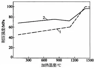 澆注料的基本配合比不變,保持耐火粉料和水泥的用量為常數。水泥的最低用量,應保證有足夠的常溫強度,以滿足低水泥耐火澆注料的拆模或吊運的技術要求。該澆注料的常溫耐壓強度分別為15MPa和22MPa。從圖中看出,在1100℃之前,水泥用量多,燒后耐壓強度高,在1400℃和1500℃時,二者基本相似,水泥用量少的略高些。