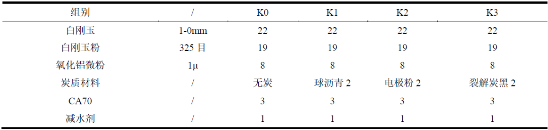 主要原料為:白剛玉,w(Al2O3)≥98.5%,w(Fe2O3)≤0.1%;氧化鋁微粉,d50=1μm;CA70水泥;減水劑;幾種炭質材料技術指標如表1所示;高爐渣化學成分如表2所示。