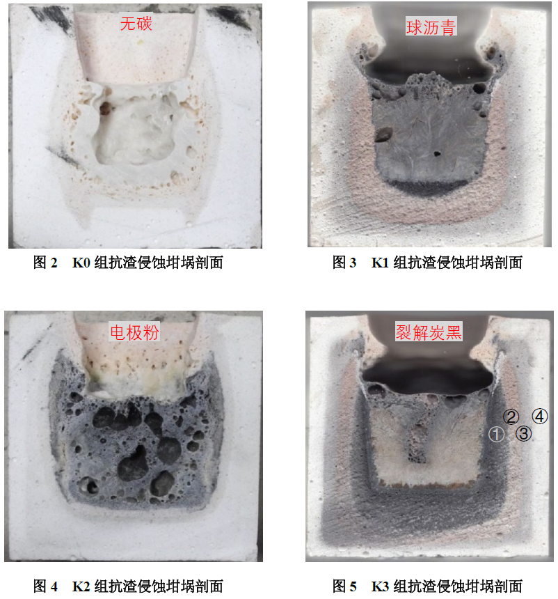 (1)球瀝青、電極粉和裂解炭黑均能夠提高材料抗渣滲透性能;就抗渣性能而言:炭黑>球瀝青>電極粉;