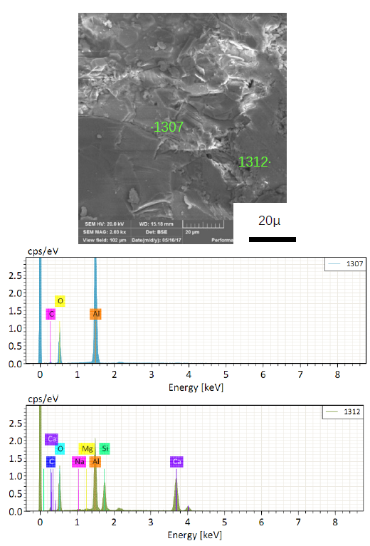EDS檢測結果也表明該部位C含量已經非常低,在圖譜上幾乎看不到C的EDS峰。這說明加入的石墨幾乎被全部氧化了。材料被侵蝕使得部分C進入渣里,因為液態渣隔絕了空氣,避免了渣中的電極粉被全部氧化而得以保存下來。EDS結果表明:即使在距離熔渣較遠的部位,也已經有熔渣滲透過去了。以上結果均表明電極粉抗氧化性差,與熔渣的潤濕性良好。不適宜在Al2O3-SiC-C鐵溝澆注料中做抗渣侵蝕原料添加。
