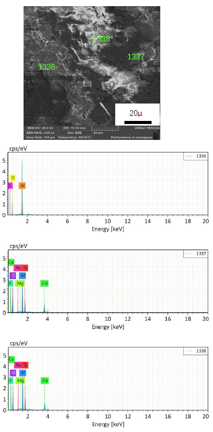 圖7K2組試樣渣侵蝕區域SEM照片及幾個點的EDS圖譜